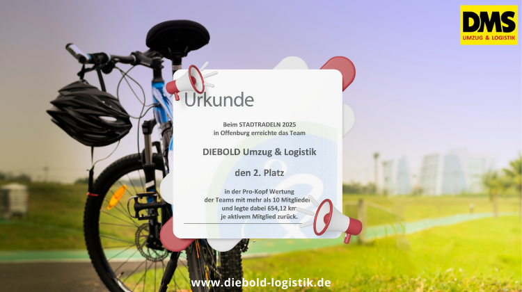 Offenburg, 7. Juli 2025 – Beim diesjährigen STADTRADELN in Offenburg konnte das Team DIEBOLD Umzug & Logistik eine beeindruckende Leistung erzielen. Mit einer durchschnittlichen Strecke von 654,12 Kilometern pro aktivem Mitglied sicherte sich das Team den 2. Platz in der Pro-Kopf-Wertung der Teams mit mehr als 10 Mitgliedern.